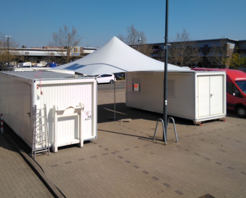 Zeltdächer zwischen Containern als geschützte Verbindung oder Arbeitsbereich